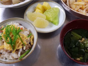 - 、タケノコごはん、豚肉と新じゃがの甘辛炒め、キャベツのごま和え、大根と人参のみそ汁、りんご